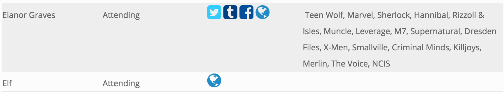 There’s no guessing involved, actually. The Escapade 2017 web site lets you see who’s registered already, and lets registered attendees share more information to make the convention and the stalk– the meeting new potential fan friends–all the more exciting. You can see who’s in what you maybe thought was a “fandom of one.” The social media icons are are live links, so you can get to know people who share your fandoms, if you wish.
